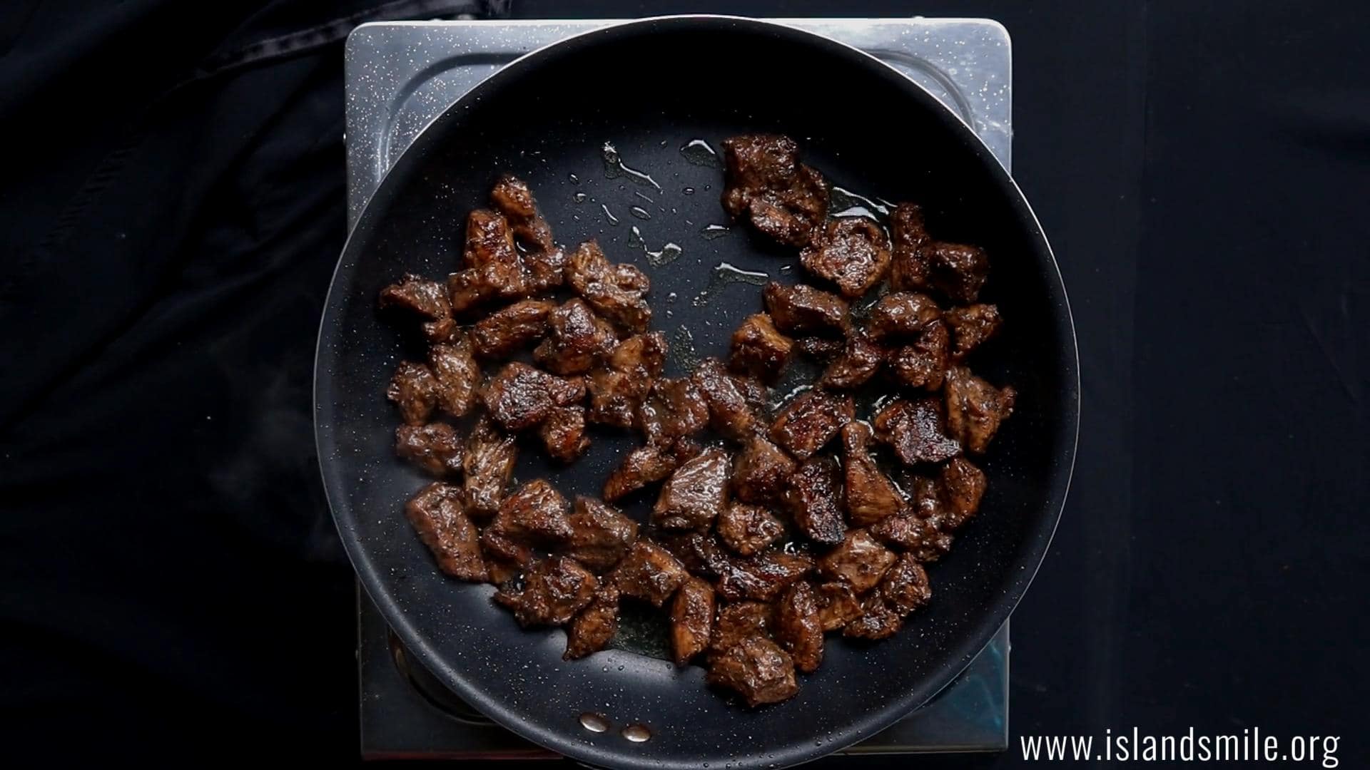 Once the oil heats, add the marinated beef to the oil(make sure you don’t add the marinade to the beef; we will be using it later in the cooking process.