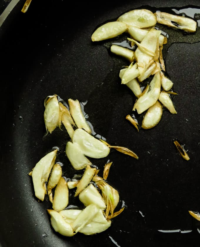 Let the oil warm for a few seconds and then add the garlic slivers, move them around with a spoon and let them turn slightly golden(remember they will continue to brown as you add other ingredients) and release the garlic aroma.