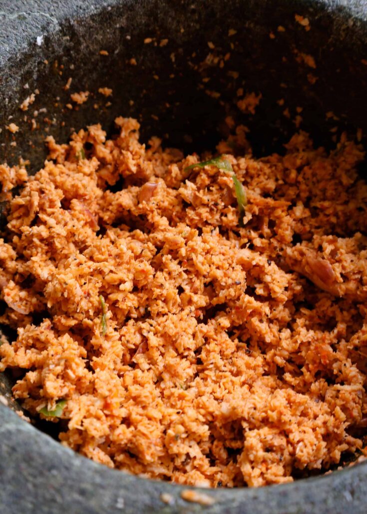 Coconut sambol or pol sambol in Sinhalese is your quintessential dish to serve with rice, bread, and string hoppers.