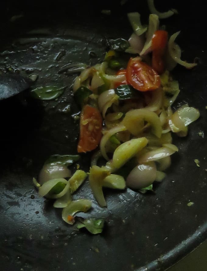 Add the curry leaves(5-6 leaves, substitute with bay leaf), chopped onions(1 large), cook until the onions turn soft.