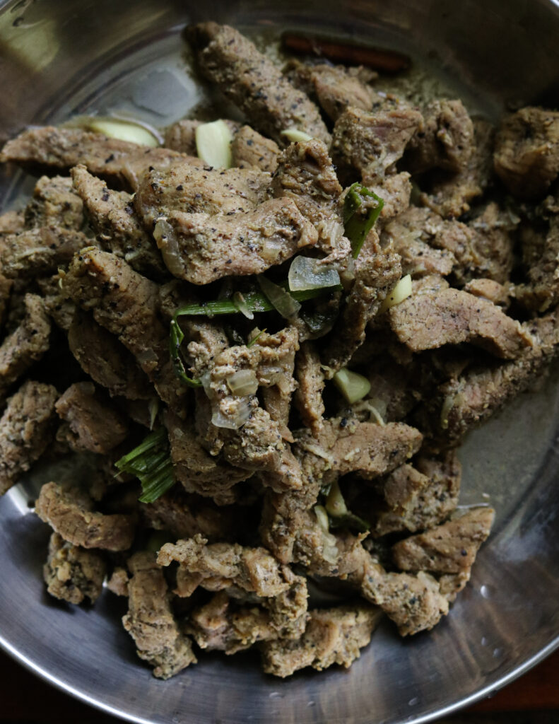 The pepper beef is made by first marinating the beef in vinegar, pepper, and other spices, then cooking it until tender.