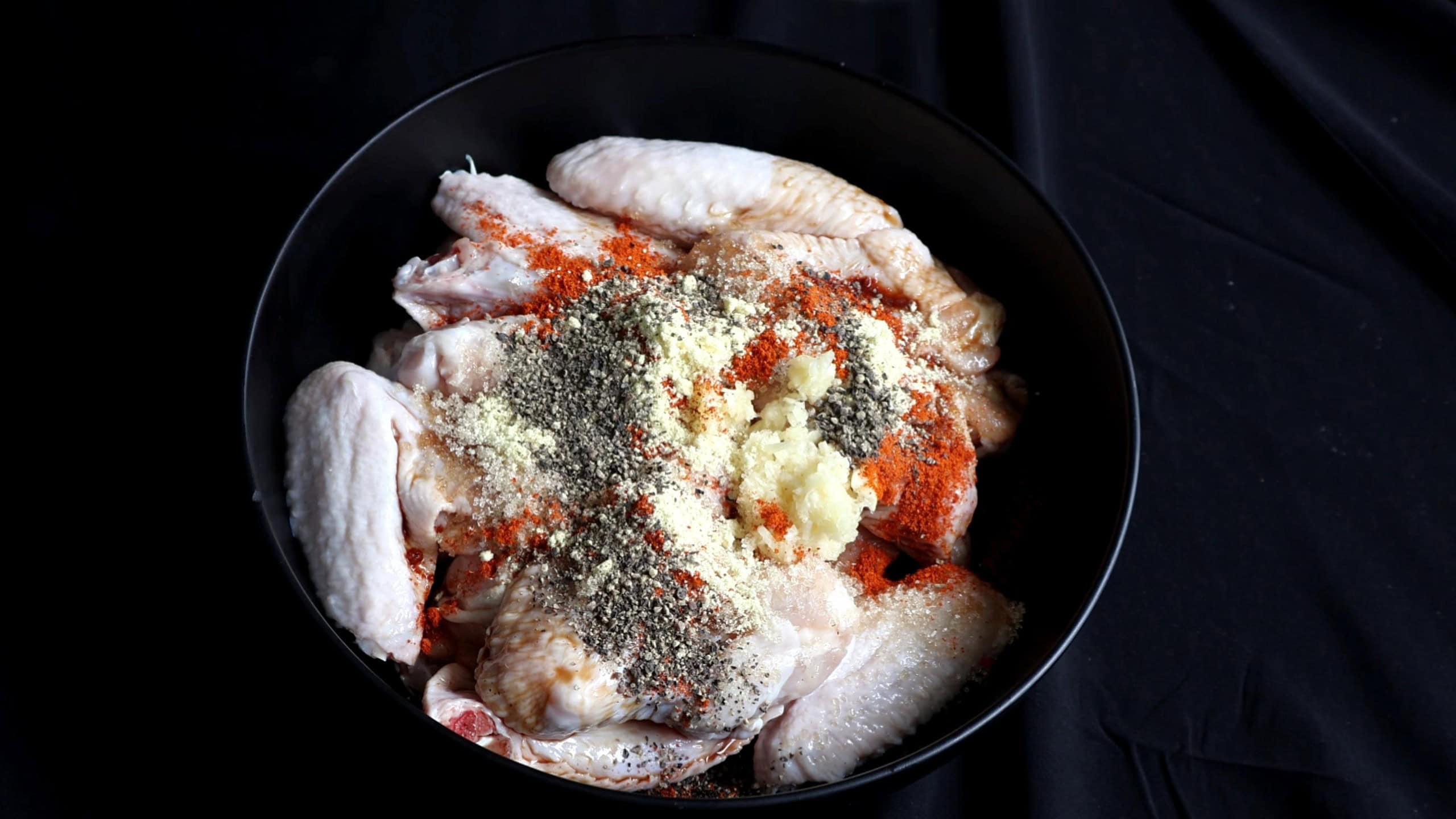 - Add soy sauce, minced garlic, red chilli powder, black pepper powder, and chicken seasoning to the wings.