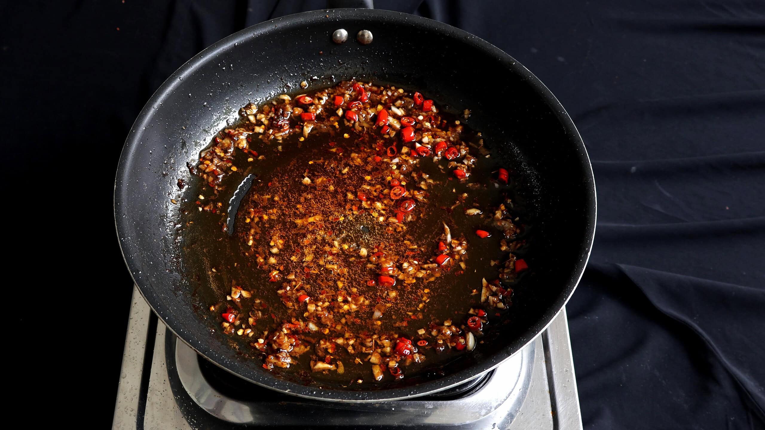 - Heat for a few seconds before adding the minced garlic, cook until they release their aroma. Then add the chopped fresh red chillies and red chilli flakes. Cook for a few seconds, constantly stir to avoid the chillies from burning.